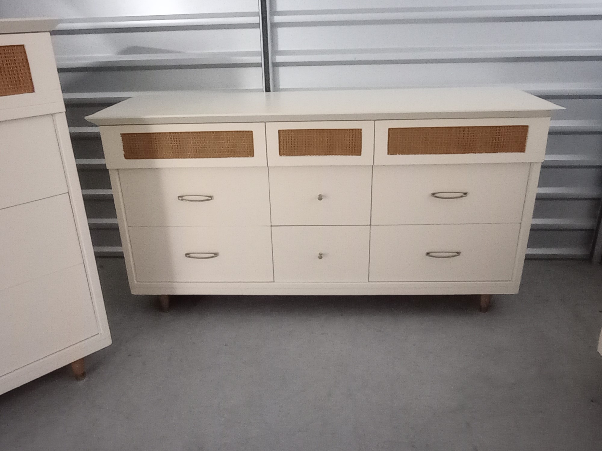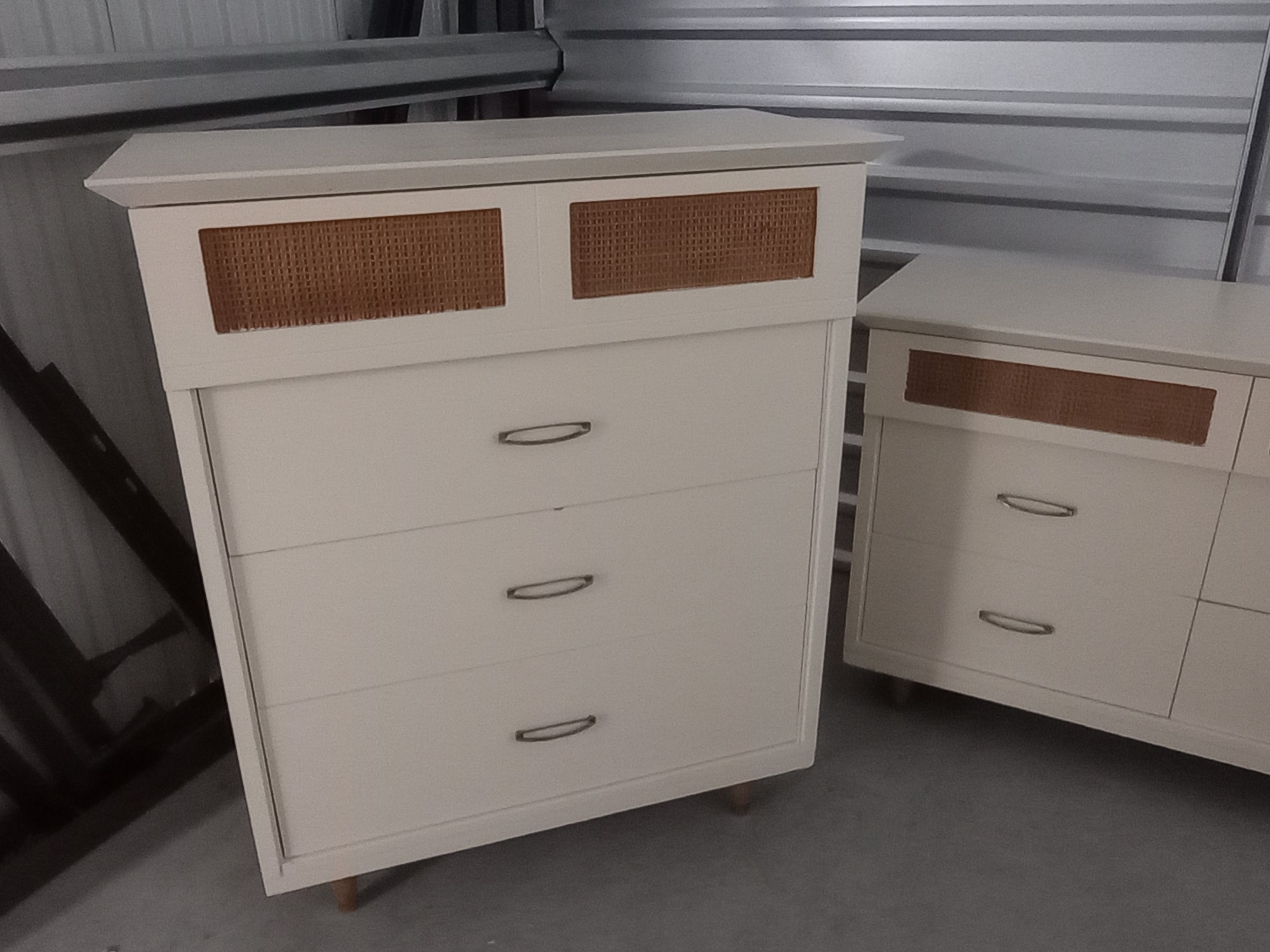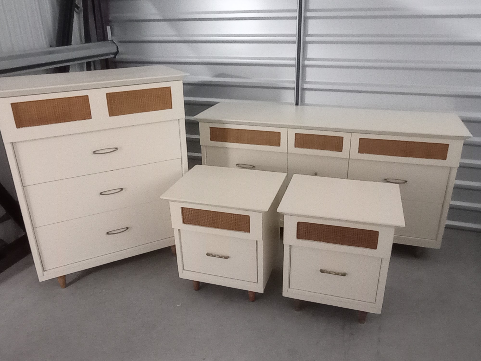 Description: This is an authentic mid-century modern bedroom set from 1959, solid wood construction, restored with antique white semi-gloss paint over a primer base, leaving the original color top-drawer front lattice accents as well as the original finish on all the legs. The pulls also are original, except for the nightstands which pulls were replaced with a different style of pull, complimentary to the rest.