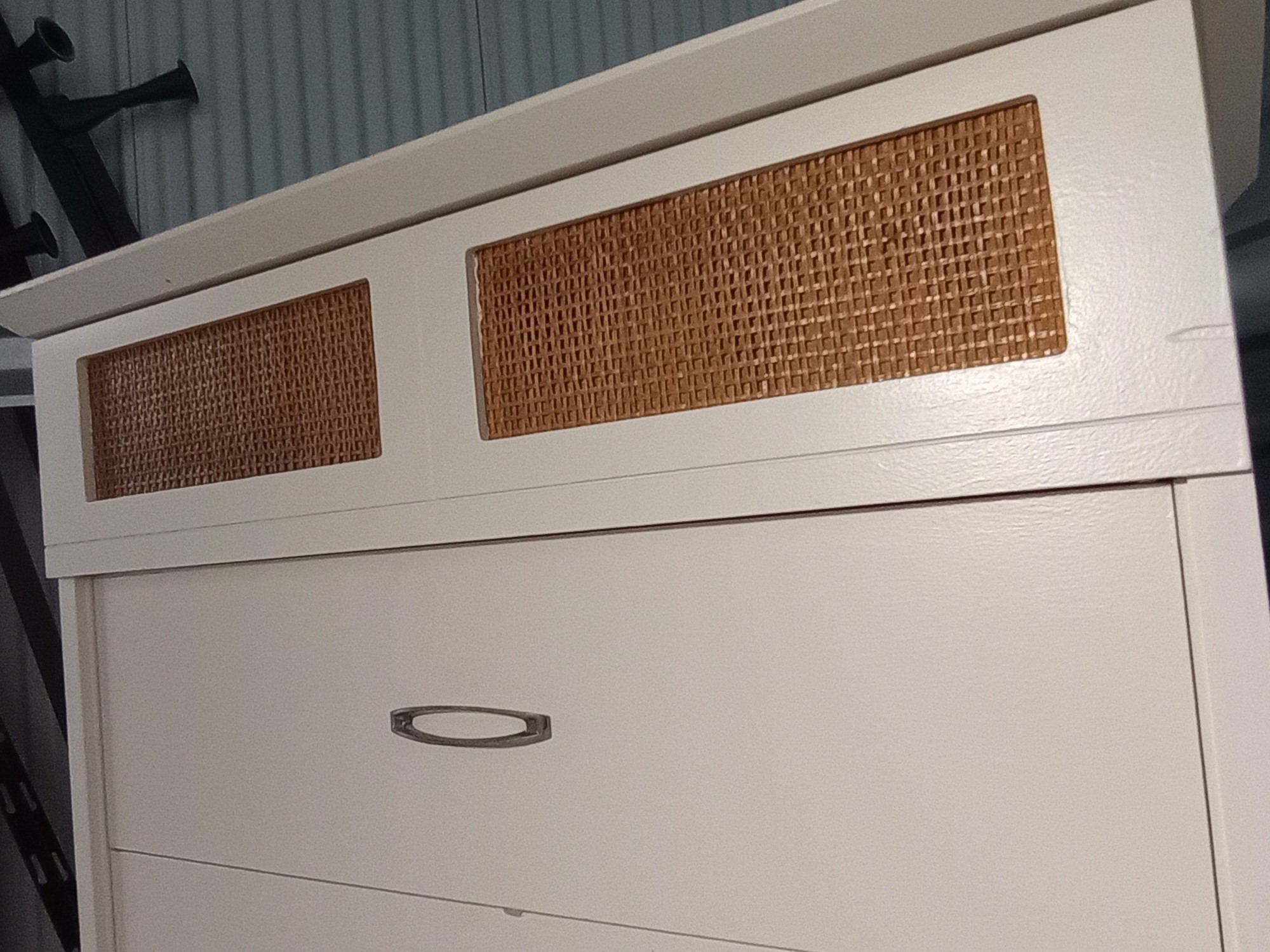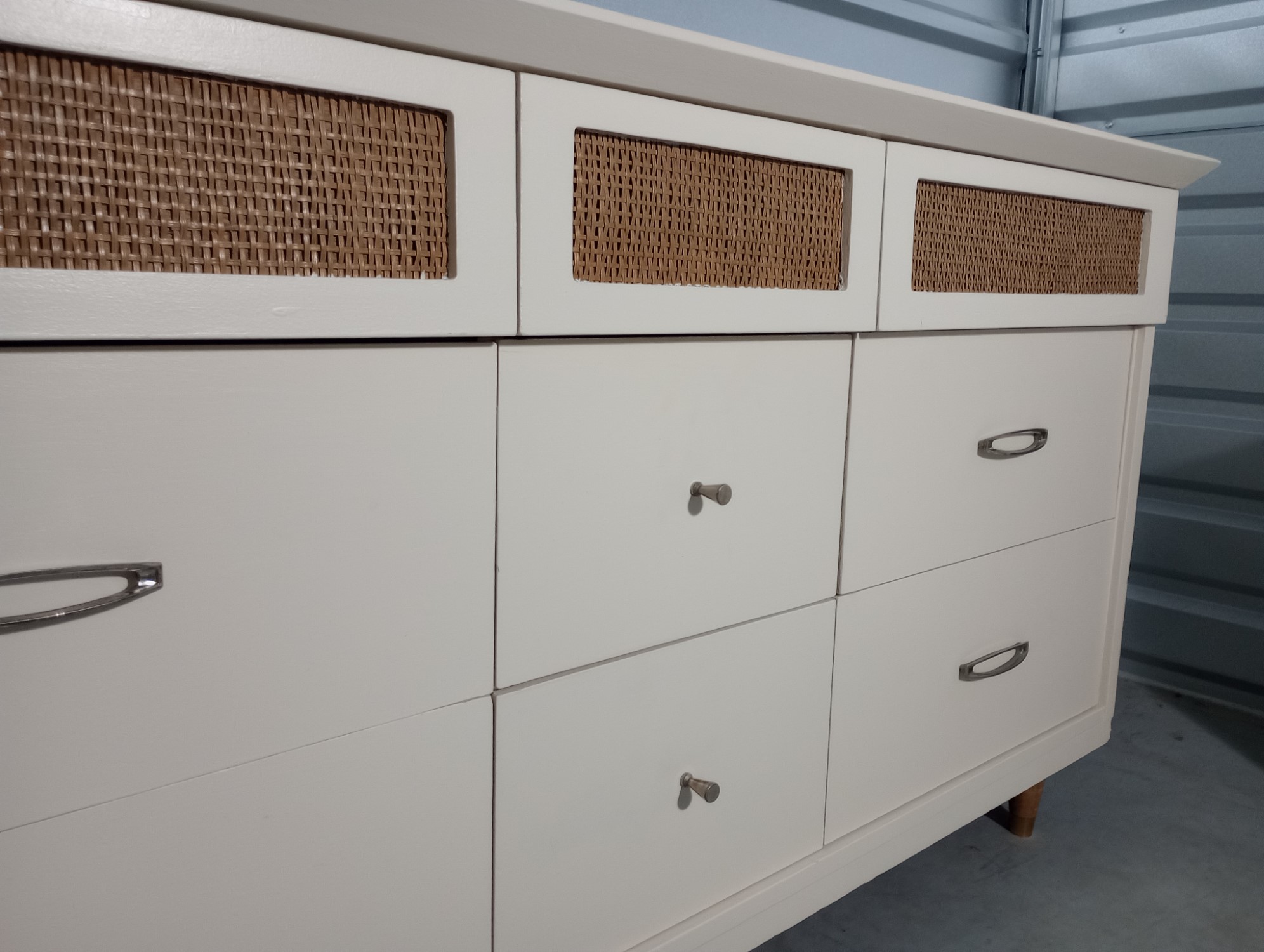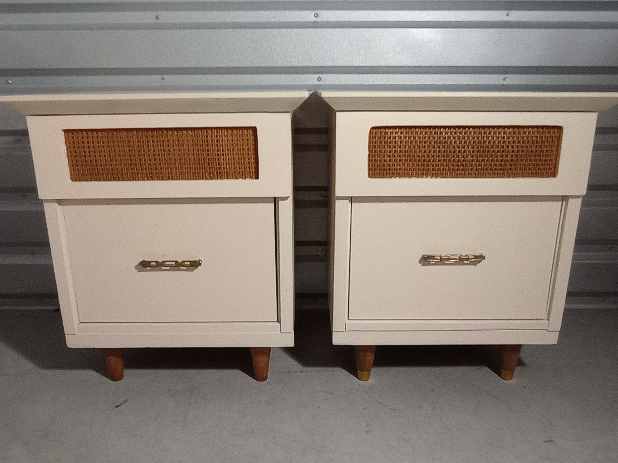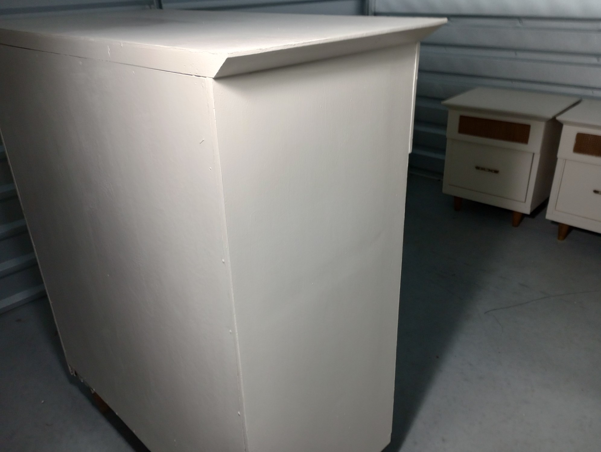 Description: This is an authentic mid-century modern bedroom set from 1959, solid wood construction, restored with antique white semi-gloss paint over a primer base, leaving the original color top-drawer front lattice accents as well as the original finish on all the legs. The pulls also are original, except for the nightstands which pulls were replaced with a different style of pull, complimentary to the rest.