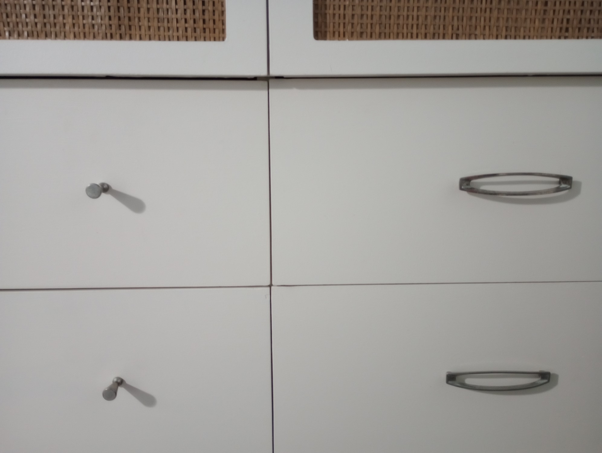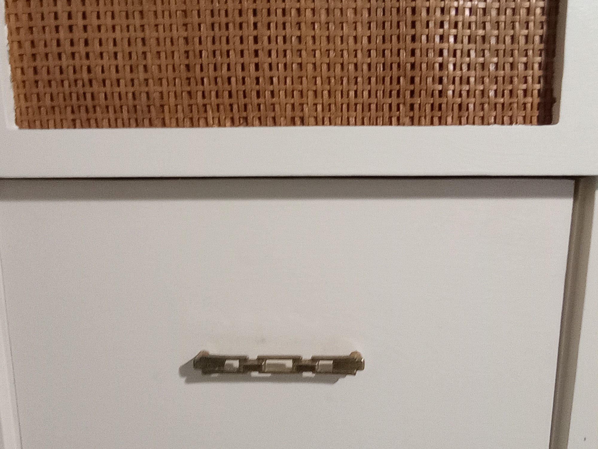 Condition: The vaneer had a few chips, some of which were filled and the smaller of which were simply primed and painted. The structure is very solid, sturdy, in excellent condition. I left the pulls in their original state, only cleaning them (I was going to paint them, but then decided that I like the authentic vintage as a contrast).