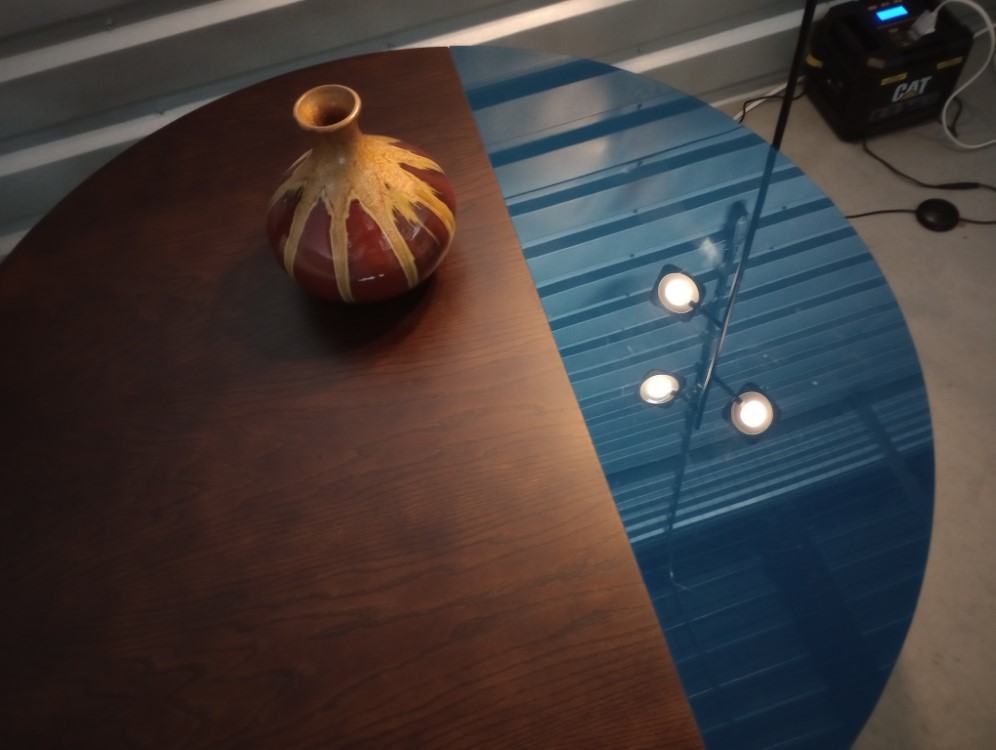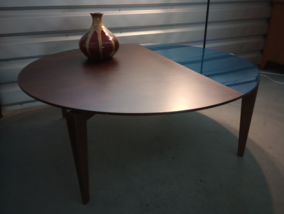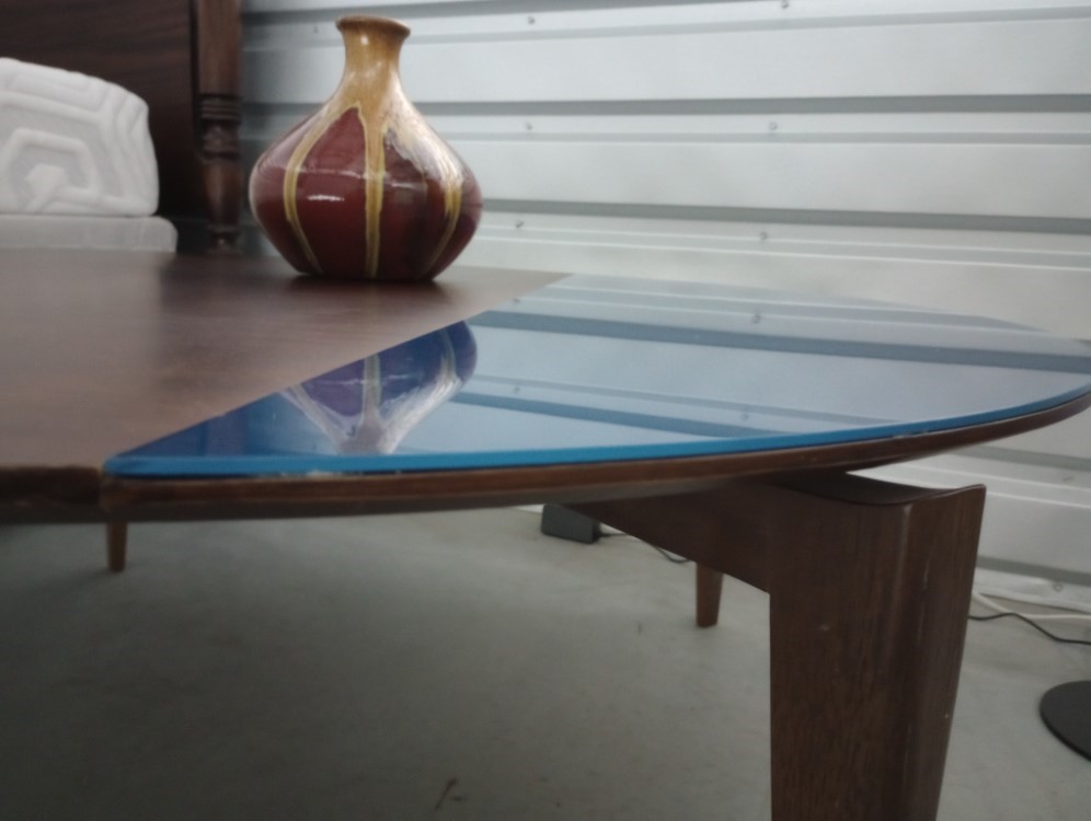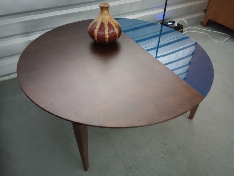 Description: This unique and beautiful coffee table is a modern round design with inset cobalt blue glass.